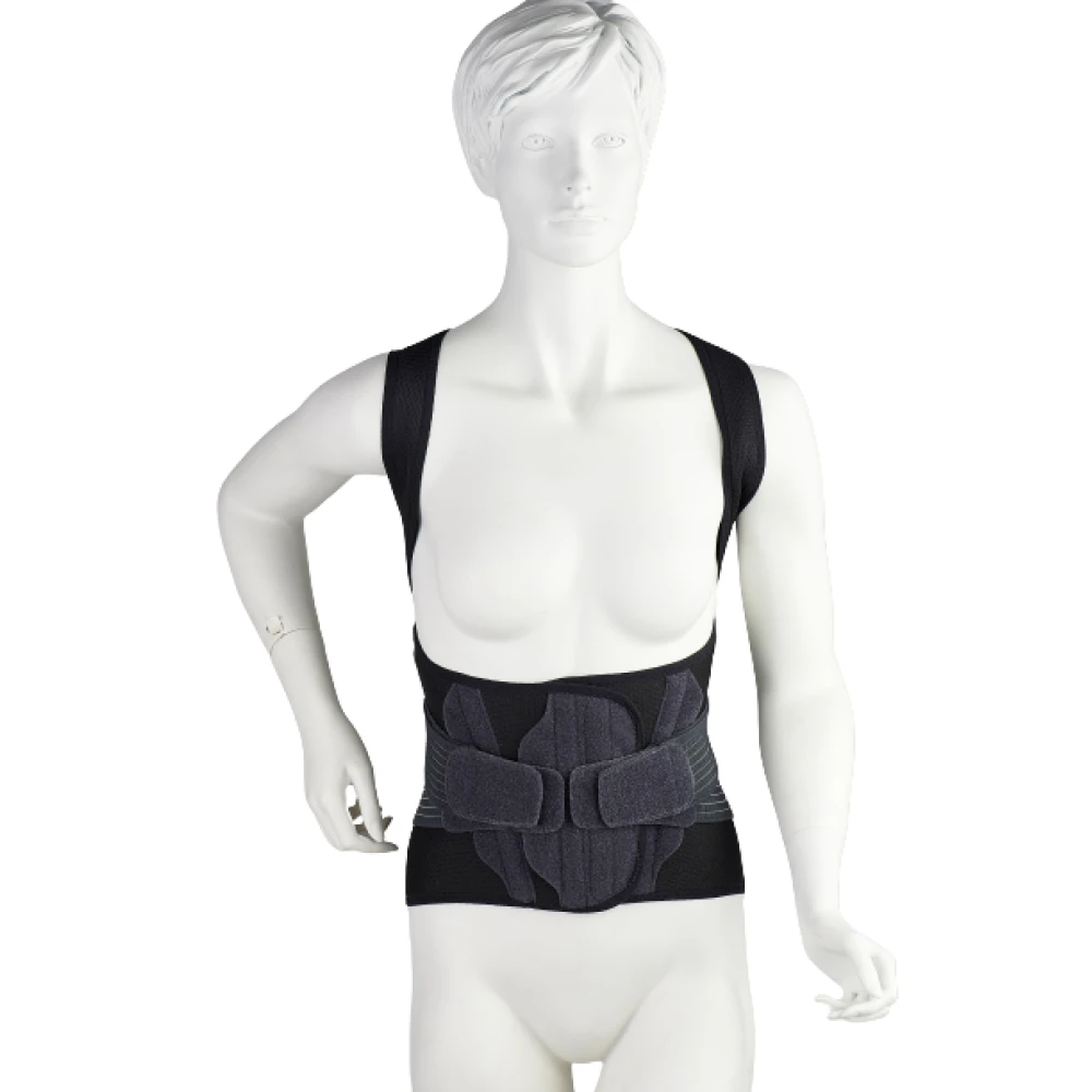 • Διαθέτει δύο ελαστικούς ιμάντες που διασταυρώνουν χιαστί στην περιοχή της ράχης και βοηθούν στην έκταση του κορμού, αυτοκόλλητους με Velcro.